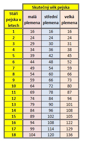 Kdysi se říkávalo, že věk psa vynásobíme 7 a máme jeho skutečný věk. Omyl. Níže uvedená tabulka udává přehled skutečného věku psa.
